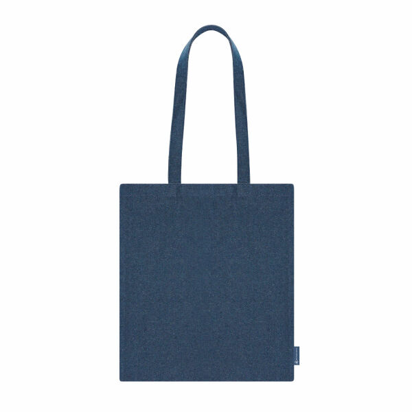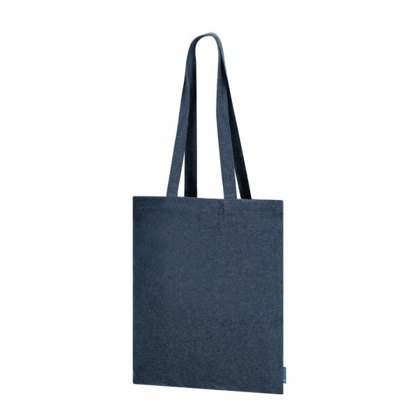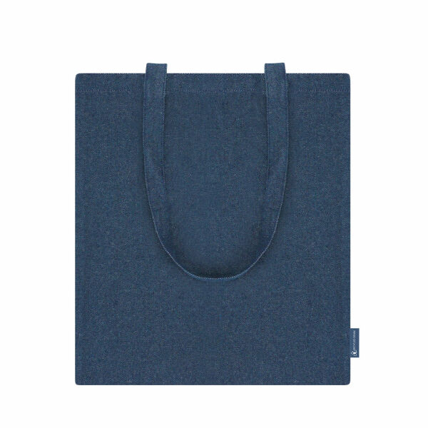 Tas gemaakt van gerecyclede denim stof van 300 g/m2. Lange handvatten van 70 cm met versteviging, genaaide afwerking. Gerecyclede denimlogo op het zijlabel en weerstand tot 8 kg gewicht.