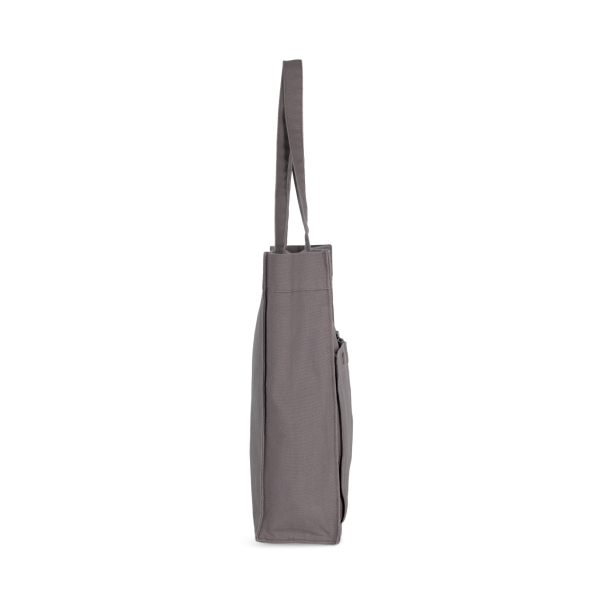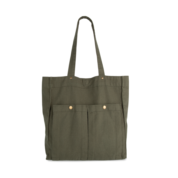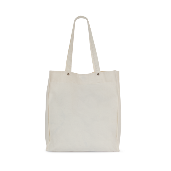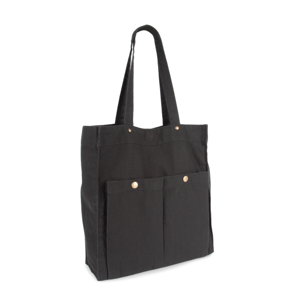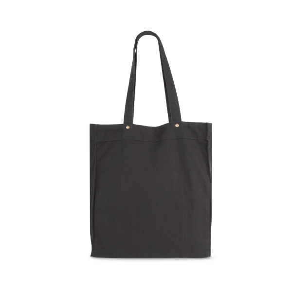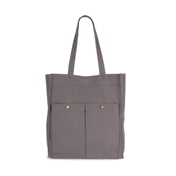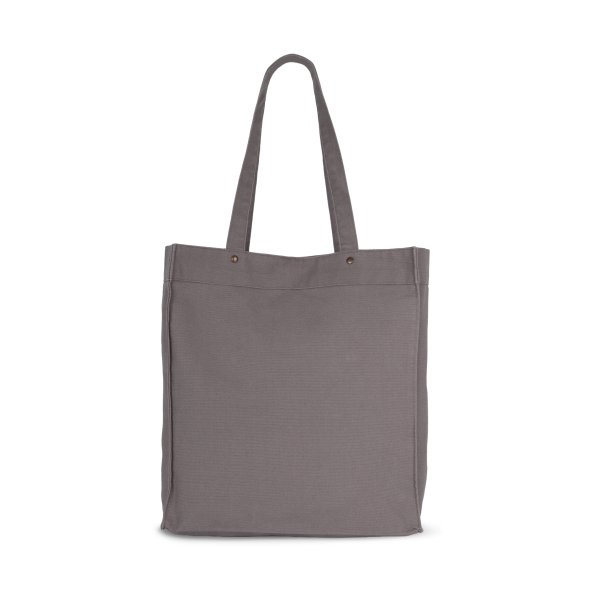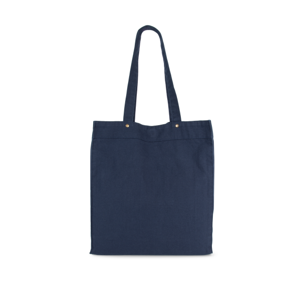 100% katoen. Handtas met brede bodem en ruimteplooi in verwassen katoen, voor een vintage look. Verwassen producten zijn uniek en kunnen lichte variaties in kleur vertonen. Hengsels in hetzelfde materiaal als de tas. Decoratieve klinknagels tussen de hengsels en de tas zelf. Sluit met een magnetische knoop. Twee grote zakken met ruimteplooi en drukknoop aan de buitenkant, voor eenvoudige personalisatie.