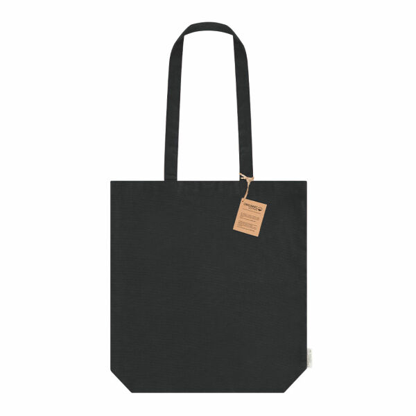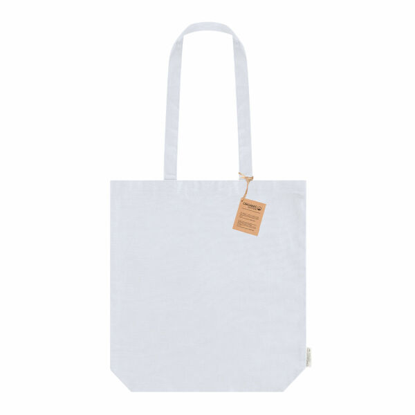 Tas vervaardigd uit 270 g/m² biologisch katoen met bodemplooien. Lange handgrepen van 70 cm met versterkte stiksels. Logo op zijlabel. Draagvermogen tot 10 kg.