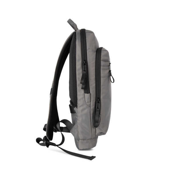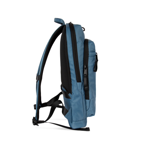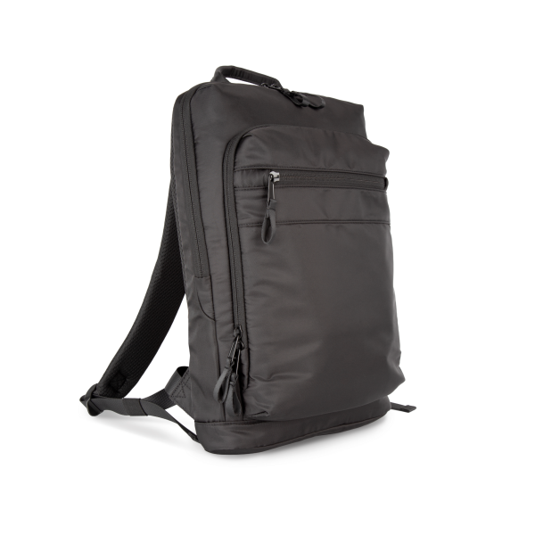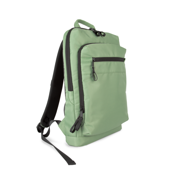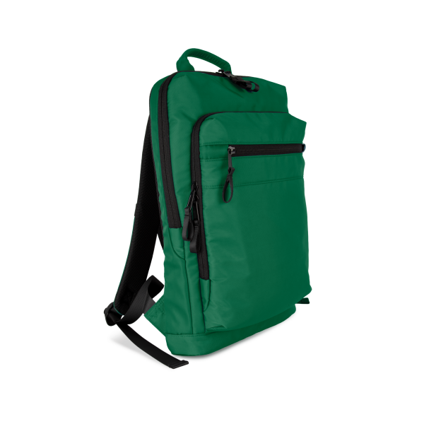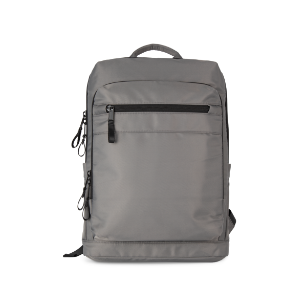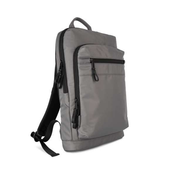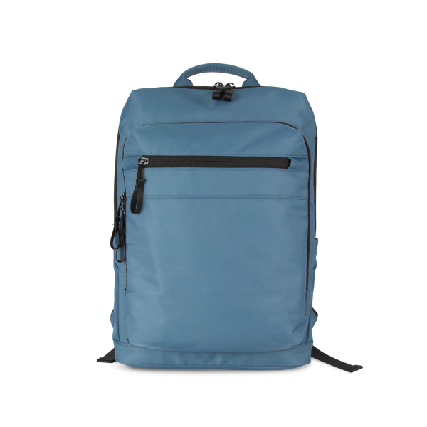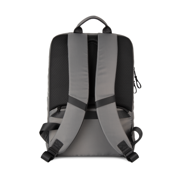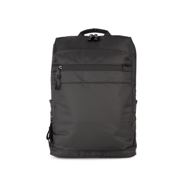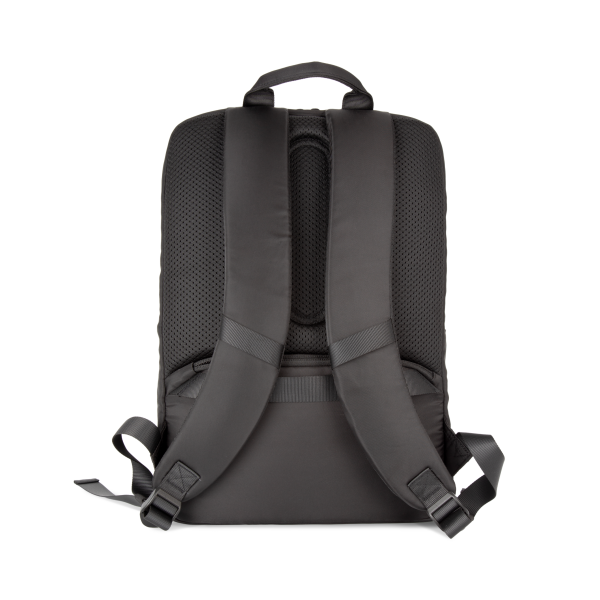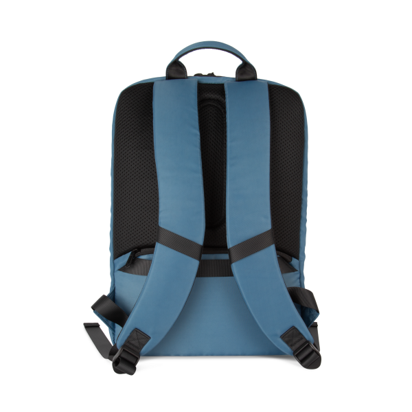 100% polyester. Exclusieve businessrugzak in gerecycled materiaal. Ingedeeld voorste vak met zak voor eenvoudige personalisatie. Hoofdvak met ruimte voor een laptop (tot 12 inch), tablet en documenten, en meerdere opbergzakken. Metalen ritstrekkers met ring, voor meer gebruiksgemak en een modern design. Ergonomische, gewatteerde, ademende en verstelbare schouderbanden. Ademende achterkant met riem om de tas vast te maken aan een trolley, voor eenvoudig transport. Veilige achterzak met gebogen ritssluiting en een hedendaagse look, ideaal om paspoort, vliegtickets en telefoon veilig in op te bergen.
