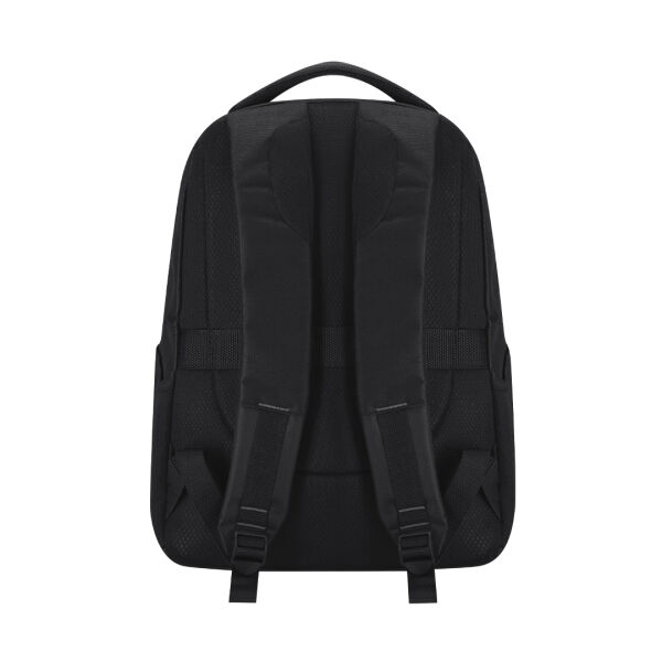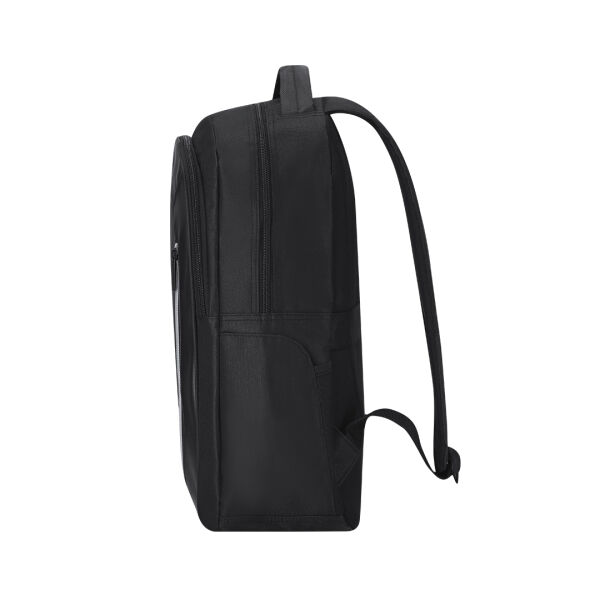Elegante rugzak van 600D-polyester met drie compartimenten. Voorzien van een RFID-beschermingssysteem dat ongeautoriseerde toegang blokkeert. Dit systeem werkt via een elektromagnetisch veld dat leessignalen verstoort en zo kaarten beschermt. Het hoofdvak met ritssluiting bevat een gewatteerd vak voor laptops tot 15 inch en een apart vak voor een tablet. Daarnaast beschikt de rugzak over een voorvak en een tweede compartiment met vakken in verschillende formaten voor flexibele opbergmogelijkheden. Twee extra zijvakken bieden extra ruimte. De gewatteerde en verstelbare schouderbanden zorgen voor optimaal draagcomfort. Voorzien van een handgreep, een achterband voor trolleybevestiging, een afneembare sleutelhanger en een RFID-label.