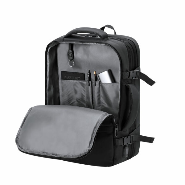 Multifunctionele, uitbreidbare rugzak gemaakt van duurzaam PU. Biedt uitstekende ventilatie aan de rugzijde en schouderbanden, wat zorgt voor een efficiënte warmteafvoer dankzij de gevoerde rug en banden. De brede schouderbanden zijn ontworpen om de druk op de schouders te verminderen en langdurig draagcomfort te garanderen.Perfect voor elke situatie dankzij de vele compartimenten:2 voorvakken in verschillende formaten.1 antidiefstalvak aan de achterzijde voor extra veiligheid.3 grote centrale compartimenten met dubbele ritstrekkers: één multifunctioneel vak, een ruim middengedeelte voor kleding en of accessoires met interne organizer en een apart vak dat ideaal is voor laptops tot 17 inch.Inclusief band voor bevestiging aan trolley of koffer en een verstelbare borstsluiting.Vakje op de linker schouderband, ideaal voor sleutels of kleine voorwerpen.Daarnaast beschikt de rugzak over een USB-oplaadpoort en een borstband met gesp voor een veilige pasvorm. Perfect voor reizen of dagelijks gebruik, dankzij de verstelbare banden die zich aanpassen aan elke levensstijl.