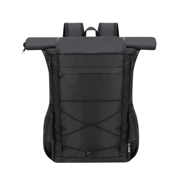 Rugzak gemaakt van 290D RPET polyester met een oprolbare ritssluiting en een tweede klittenbandsluiting. Hij heeft een voorvak met een onzichtbare rits, evenals een verstelbaar elastisch koord aan de voorkant. Twee extra zijvakken. Interieur met grote capaciteit en een gevoerd compartiment voor laptops tot 15 inch. Gevoerde schouder- en rugbanden voor extra comfort. RPET-logo op het buitenste label.