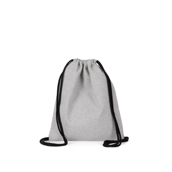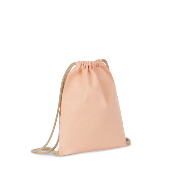 Katoen / Polyester. Tasje met koordje, bestaande uit 75% gerecycled katoen / 22% gerecycled polyester / 3% andere vezels (Deep Water), 75% gerecycled katoen / 20% gerecycled polyester / 5% andere vezels (Flint Grey), 70% gerecycled katoen / 30% gerecycled polyester (Topaz Blue, Ecume, Salmon). Sluiting met dik aanrijgkoord. Kindermaat. Bestaat in volwassen versie KI5102.