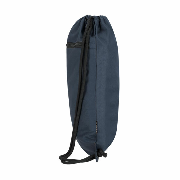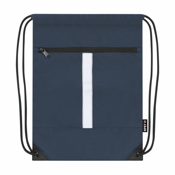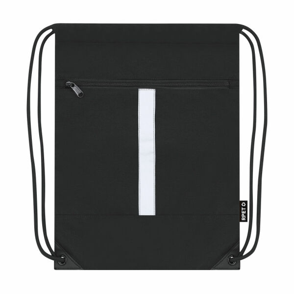 Reflecterende rugzak van 300 RPET polyester, met reflecterende voorste strip. Er zit een zakje aan de voorkant. Zelfsluitende touwen in zwart en hoeken versterkt met metalen ringen.